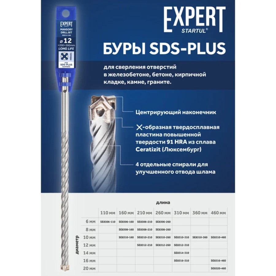 Бур (сверло) 10х100х160 мм SDS-plus EXPERT STARTUL (SE8310-160) — надежный и высокоэффективный инструмент для сверления в особо твердых строительных материалах. Он предназначен для работы с железобетоном, бетоном, кирпичной кладкой, камнем и гранитом. Благодаря цельному X‑образному твердосплавному наконечнику Ceratizit с четырьмя режущими кромками, бур демонстрирует отличную производительность и долговечность даже при высоких нагрузках. Специальный припой, удерживающий наконечник, рассчитан на экстремальные температуры и значительные ударные воздействия, что делает инструмент устойчивым к износу при интенсивной эксплуатации.