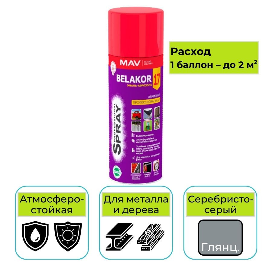 Купить Эмаль-аэрозоль MAV BELAKOR 17 серебристо-серый глянцевая 520 мл алкидная профессиональная RAL 7001 можно с доставкой в