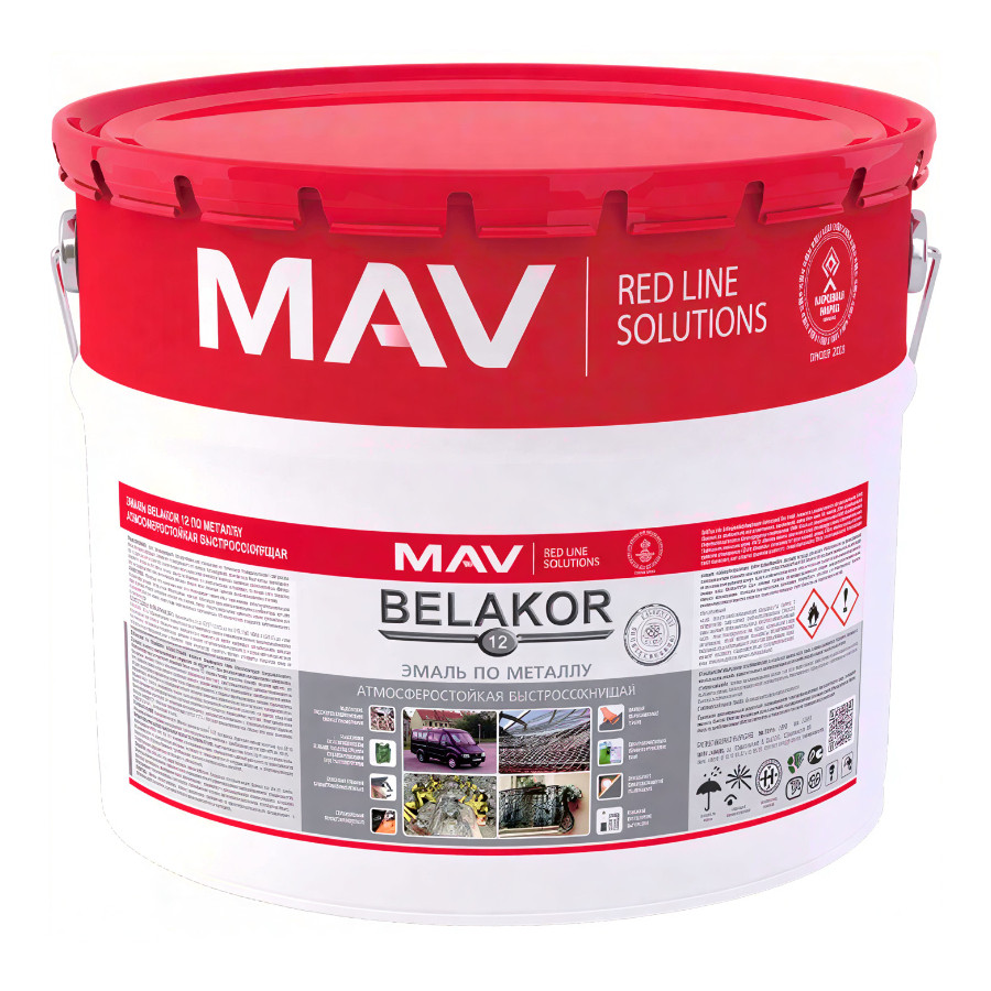 Эмаль MAV BELAKOR 12 небесно-голубая 10 л по металлу быстросохнущая - это стойкое лакокрасочное покрытие, которое изготавливают на основе алкидного лака с добавлением различных растворителей и пигментов. Подходит Для наружных работ. Она позволяет прокрасить различные конструктивные элементы, в частности металлоконструкции.