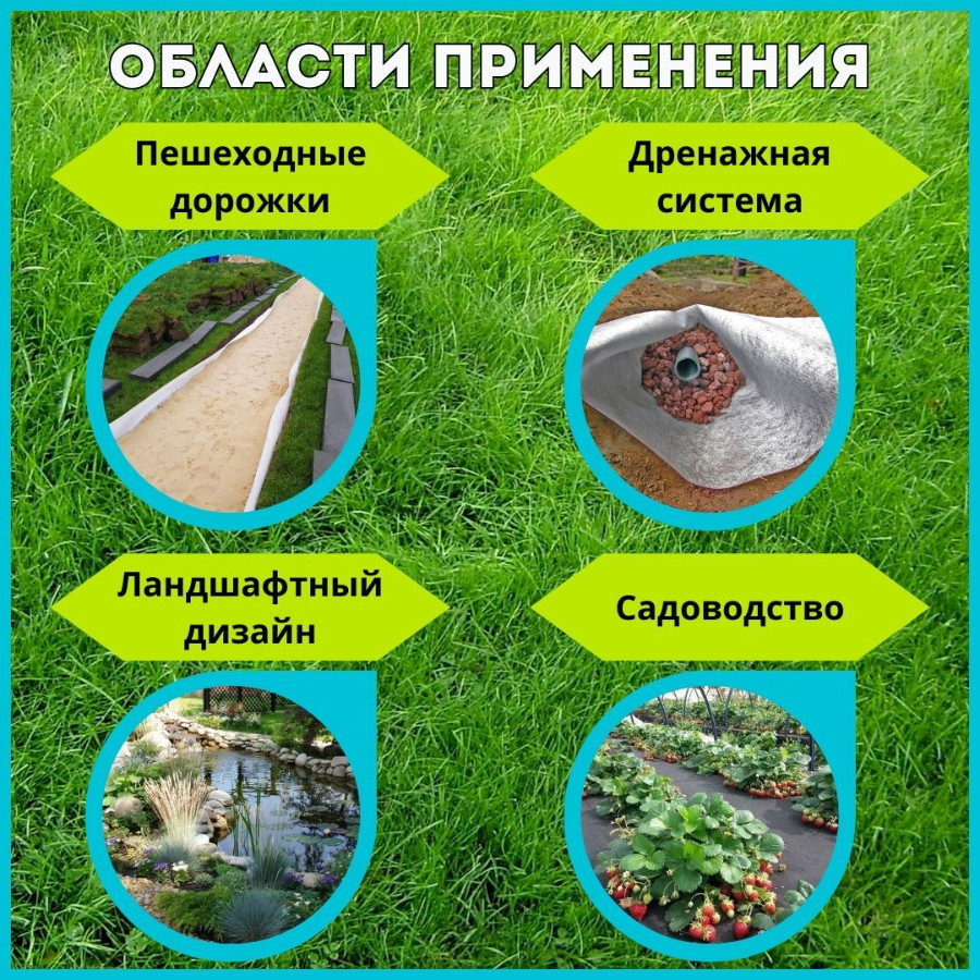 - Ландшафтный дизайн. Полотно из полиэфирного волокна идеально подходит для оформления парков, скверов и садовых участков. Легко укладывается, исключает эрозию. Материал незаменим при создании сложных ландшафтных объектов: многоуровневых водоемов, водопадов, бассейнов и клумб. Он помогает сохранить форму сооружений и устраняет прорастание сорняков, облегчая уход за садом.