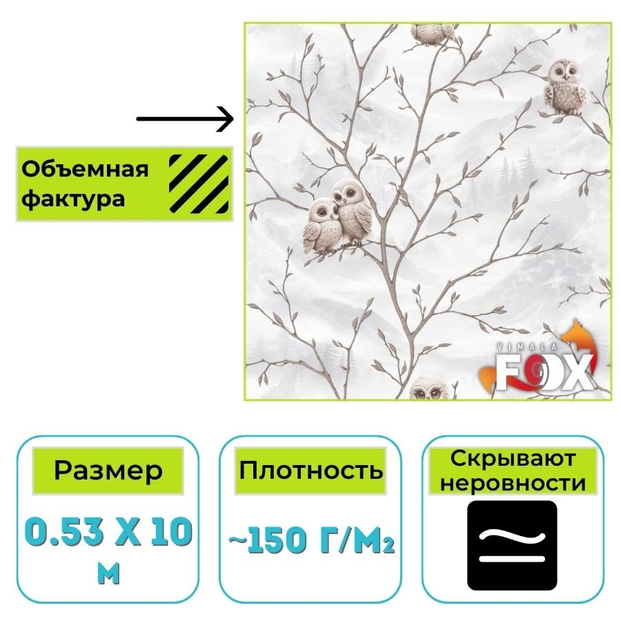 Бумажные тисненые обои дуплекс Vimala Совушка – это не просто отделка, а выразительный элемент дизайна, который придаст пространству характер и индивидуальность. Выбирая эту коллекцию, вы получаете проверенное качество и долговечность по разумной цене.