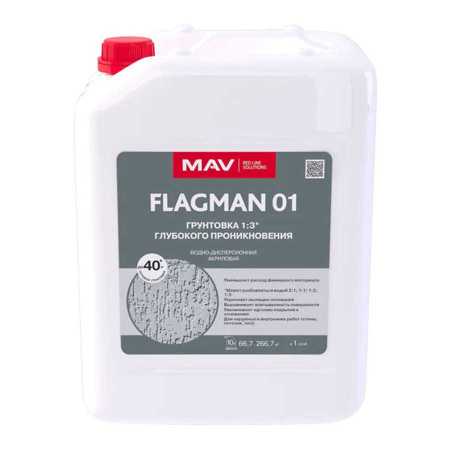 Акриловая грунтовка глубокого проникновения для наружных и внутренних работ MAV FLAGMAN 01 является профессиональным решением для качественной подготовки поверхностей. Продукт гарантирует надежность, долговечность и высокое качество финишной отделки в различных условиях применения.