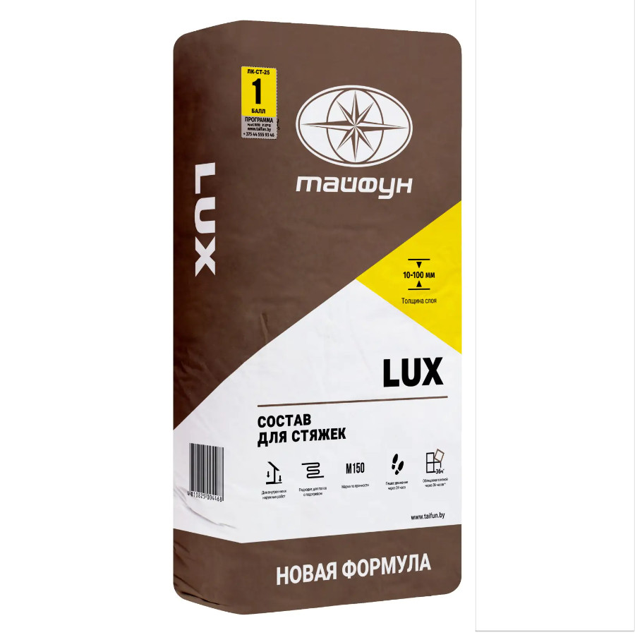 Смесь для стяжки цементная Тайфун LUX 25 кг - это передовое решение для создания безупречного основания пола. Этот высокотехнологичный продукт, созданный на основе цемента и специально подобранных минеральных добавок, обеспечивает непревзойденное качество и долговечность напольного покрытия. После смешивания с водой и правильного нанесения, вы получите исключительно прочное и ровное основание, готовое к укладке финишного покрытия или дальнейшему выравниванию.