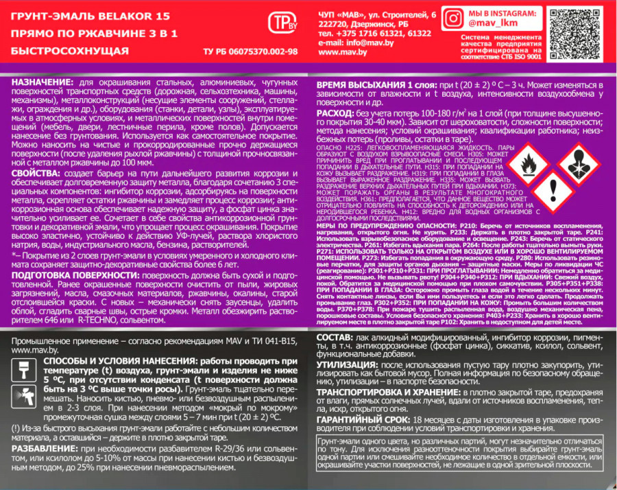Грунт-эмаль алкидная быстросохнущая МАВ Белакор 15 прямо по ржавчине 3 в 1 графитовая матовая 1 л в нашем интернет-магазине по выгодной цене и с удобной доставкой по Бресту и Брестской области.