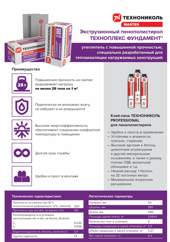 Экструдированный (экструзионный) пенополистирол для пола ТехноНИКОЛЬ XPS Техноплекс Фундамент - это универсальный теплоизоляционный материал для фундамента, сочетающий в себе высокую прочность, низкое водопоглощение и отличные теплоизоляционные свойства. Благодаря своим характеристикам, он обеспечивает надежную и долговечную защиту от теплопотерь в различных строительных конструкциях, особенно в условиях сильных нагрузок и повышенной влажности.