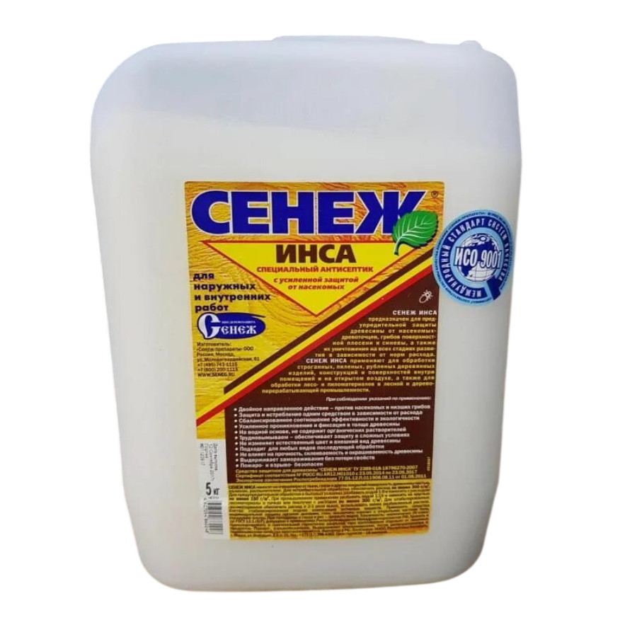 Антисептик от насекомых-древоточцев Сенеж Инса 5 кг - это специальная пропитка, которая уничтожает плесень, грибок и насекомых. Он воздействует не только на верхний слой древесины, но и проникает вглубь. После высыхания средство абсолютно безопасно как для людей, так и для животных. После нанесения обеспечивает длительную защиту, при этом не влияет на натуральную структуру и позволяет дереву "дышать".
