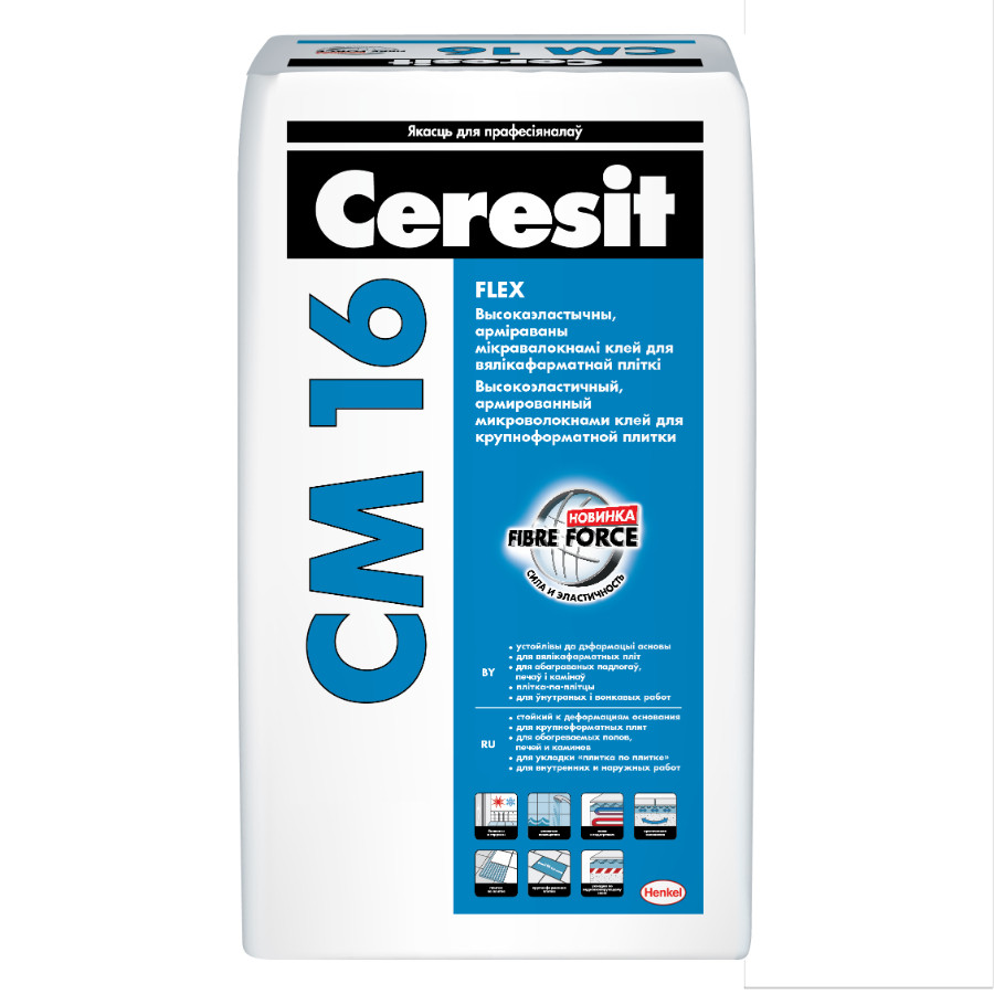 Клей для плитки высокоэластичный Ceresit CM 16 Flex 25 кг с очень широкой областью применения используется для керамических, глазурованных, цементных и каменных плиток (кроме мрамора) на жесткие, деформируемые и проблемные основания. Также рекомендуется для облицовки гибких перегородок (гипсокартонных и гипсоволокнистых плит, плит OSB, магнезитовых плит), обогреваемых полов, фасадов, террас и балконов, а также в чашах бассейнов и резервуарах с водой.