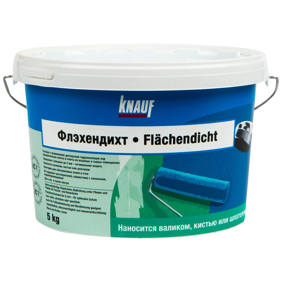 Делал ремонт в туалете, надо было под плитку гидроизоляцию положить. Взял Кнауф Флэхендихт по совету знакомого отделочника. Удобно, что уже готовая в ведре, не надо ничего замешивать. Просто открыл и перемешал палкой. Наносил обычным малярным валиком, голубой цвет реально помогает не пропустить участки. Минус заметил один: если наносить слишком тонко, то просвечивает и сложно контролировать равномерность. Но в целом очень доволен, после укладки плитки все идеально, никакой влаги. Для бытового ремонта самое то.