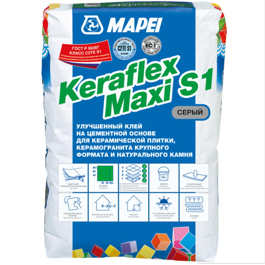 Клей для плитки эластичный Керафлекс Мапей Макси С1 — профессиональный эластичный состав класса S1. Плиточный клей демонстрирует адгезию свыше 2.6 МПа, соответствует EN 12004 и ГОСТ Р 56387. Оптимален для керамогранита, камня и плиток размером до 30x30 см.