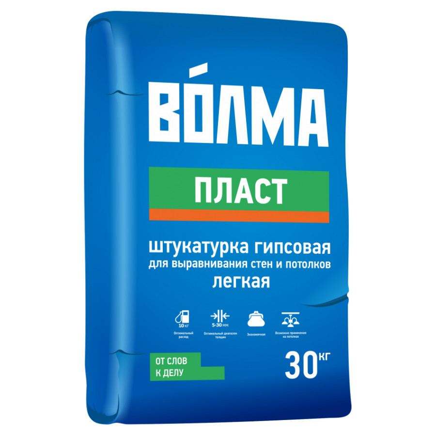 Штукатурка ВОЛМА Пласт 30 кг на основе натурального гипса, легкого заполнителя, минеральных наполнителей и модифицирующих добавок, обеспечивающих высокую адгезию, водоудерживающую способность и оптимальное время работы.