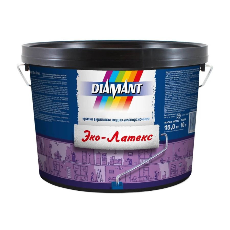 Краска Диамант Эко-Латекс белая матовая 5 л - это материал на водной основе в состав которого входит латексный полимер. Благодаря своим свойствам она применяется для окрашивания стен практически в любом помещении. Используется для окраски новых минеральных поверхностей (штукатурка, бетон, гипсокартон и др.), а также поверхностей, ранее окрашенных водно-дисперсионными красками.