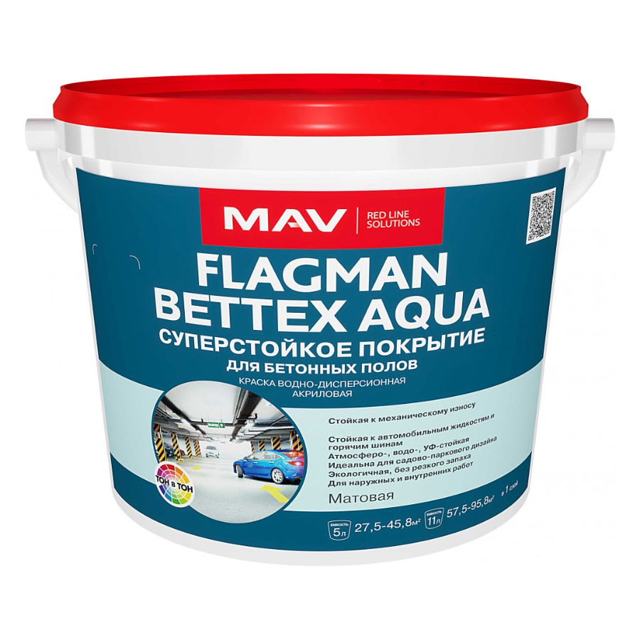Краска MAV Flagman Bettex Aqua желтая матовая 11 л предназначена для окраски новых и ранее окрашенных акриловыми красками бетонных полов, цементно-песчаных стяжек, лестниц, стен внутри общественных, жилых и производственных зданий (торговые, выставочные залы, школы, кинотеатры и т. п.), в том числе неотапливаемых и/или с повышенной влажностью (прачечные, склады, производственные и бытовые помещения, подвалы, балконы, гаражи и т. п.), а также бетонных и цементно-песчаных дорожек, бордюрного камня, тротуарной плитки, кирпича, эксплуатирующихся в атмосферных условиях.