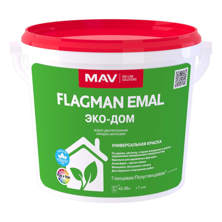 Краска алкидно-акриловая МАВ Флагман эмаль Эко-дом база TR полуглянцевая 5 л - водно-дисперсионная алкидно-акриловая краска для работы по дереву, металлу, старым алкидным и минеральным поверхностям. Применяется внутри и снаружи помещений. Устойчива к воздействию осадков, солнца. Моющаяся, с высокой степенью глянца. Не имеет резкого запаха, благодаря чему подходит для окраски школ, детских садов, поликлиник.