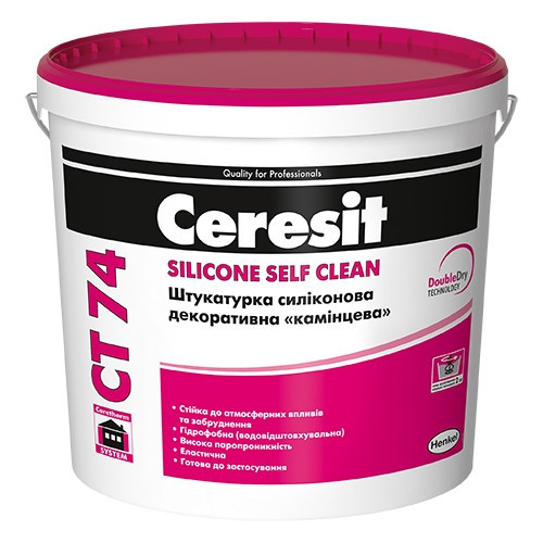 Силиконовая штукатурка Ceresit CT 74 (Церезит СТ 74) белая 1,5 мм с фактурой "камешки"– это полимерная фасадная штукатурка, состоящая из каменной крошки и полимерного вяжущего, содержащего силиконовые добавки, благодаря которым, материал получает повышенную прочность, увеличенную стойкость к воздействию воды и влаги, а также высокую паропроницаемость, что делает его доступным к применению в фасадных системах с минераловатными утеплителями, а также по основаниям с высоким показателем влагонасыщения (например, по газобетонным блокам, керамическому кирпичу, цементным штукатурным составам). Силиконовые компоненты наделяют декоративное покрытие способностью к самоочищению. Материал надежно защищает ограждающие конструкции стен фасадов от воздействия влаги, перепадов температур, воздействия ветра, УФ излучения и других факторов окружающей среды.