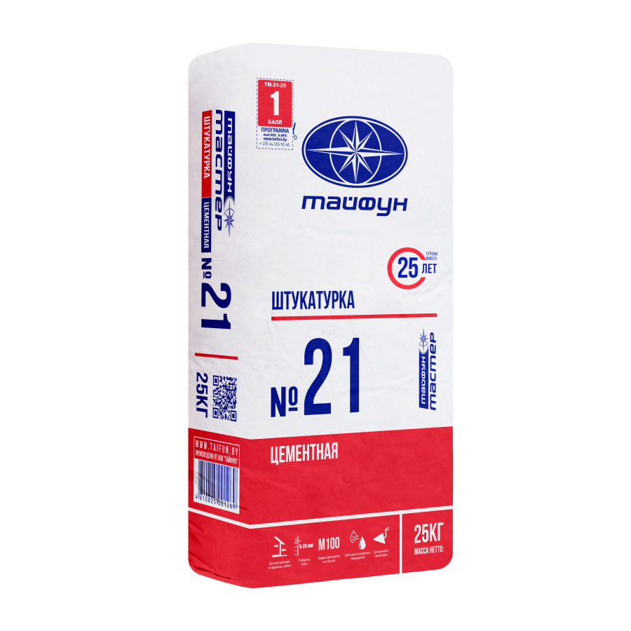 Цементный штукатурный состав «Тайфун Мастер» № 21 производится в виде сухой смеси, состоящей из цементного вяжущего, полимерного связующего, наполнителя и специально подобранных модифицирующих добавок высокого качества. Благодаря улучшенному составу продукт обеспечивает:
