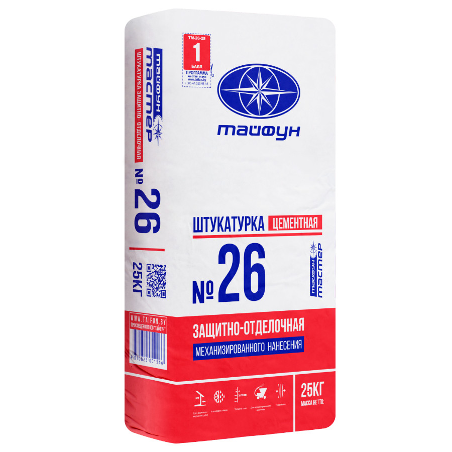 Штукатурка «Тайфун Мастер» № 26 производится в виде сухой смеси, состоящей из цементного вяжущего, полимерного связующего, наполнителя и специально подобранных модифицирующих добавок, которые обеспечивают: