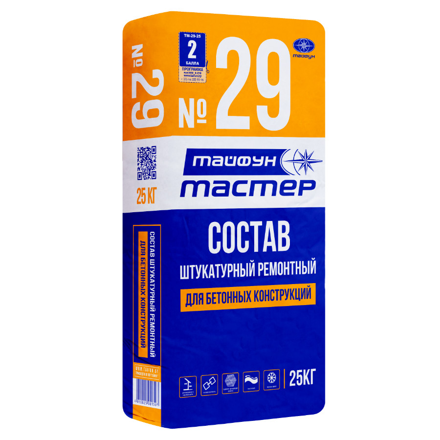 СОСТАВ ШТУКАТУРНЫЙ РЕМОНТНЫЙ ДЛЯ БЕТОННЫХ КОНСТРУКЦИЙ «Тайфун Мастер» №29 применяется для ремонта и защиты поврежденных бетонных и железобетонных конструкций. Обладает высокой адгезией и прочностью.
