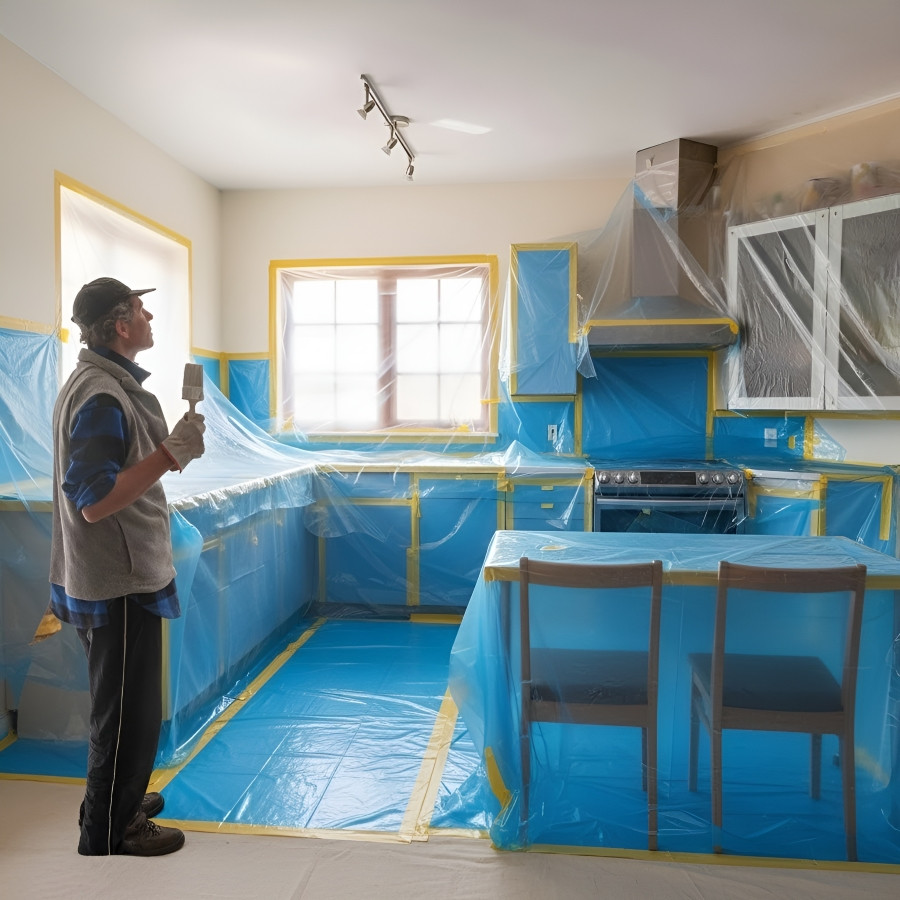 - Сочетание укрывочной пленки и малярной ленты для быстрого монтажа.