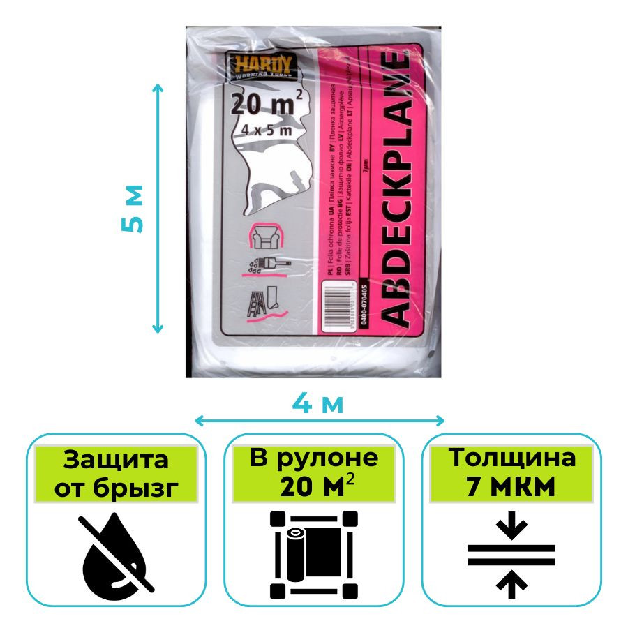 Пленка укрывная 4х5 м 7 мкм Hardy Scley (0400-070405) предназначена для комплексной защиты объектов от загрязнений и повреждений в процессе различных работ. Ее ключевая особенность – способность к многократному применению без потери свойств.