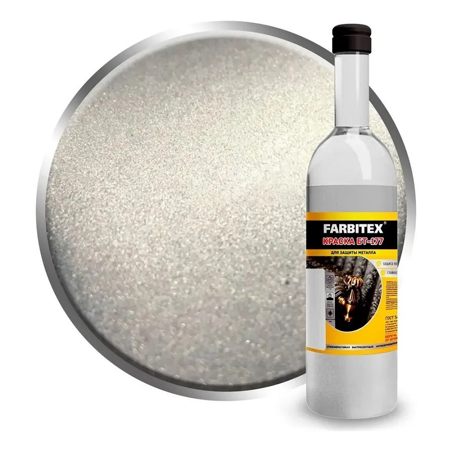 Алкидная краска по металлу FARBITEX — это надежный барьер против разрушения материалов. Благодаря уникальной формуле краски серебрянки БТ-177 Фарбитекс вы получаете долговечное покрытие с эффектом «жидкого металла», которое сочетает практичность и эстетику.