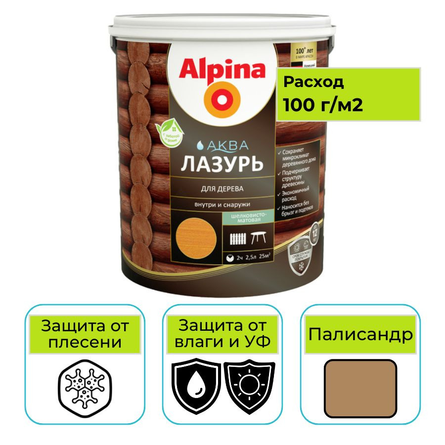 Лазурь для дерева Альпина АКВА палисандр шелковисто-матовая - это экологичная, тонкослойная лазурь на водной основе для обработки древесины. Прекрасно сохраняет текстуру, отлично защищает от атмосферных воздействий и влаги внутри и снаружи помещений. Обеспечивает длительный срок службы деревянных поверхностей. Сохраняет и подчеркивает текстуру дерева. Максимальная долговечность покрытия достигается при использовании заколерованного материала. Возможно использование Alpina Аква Лазурь для дерева в качестве промежуточного слоя под водоразбавляемые лаки и эмали.