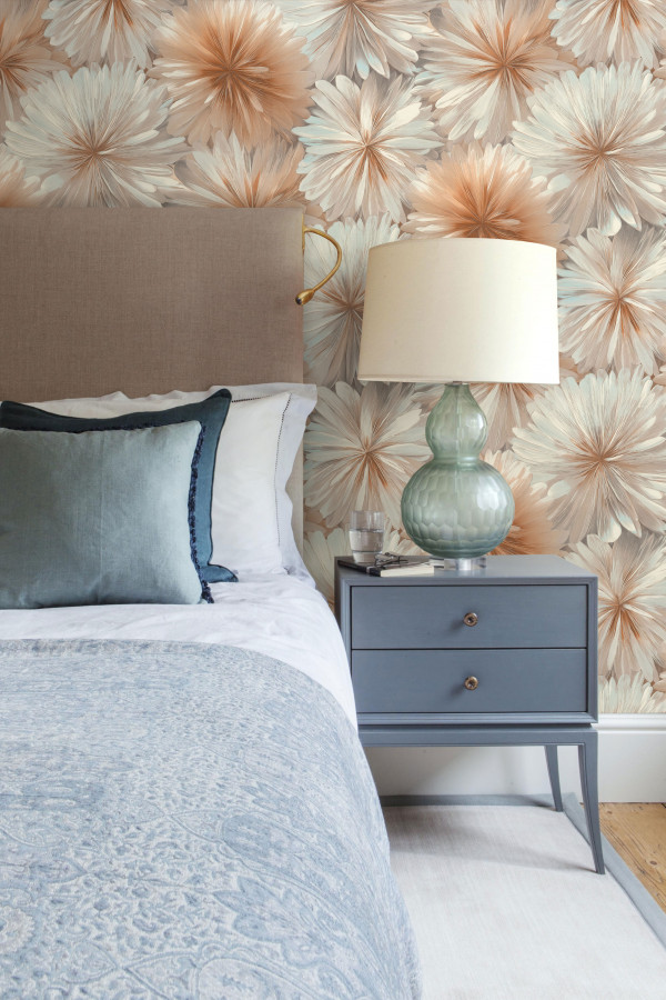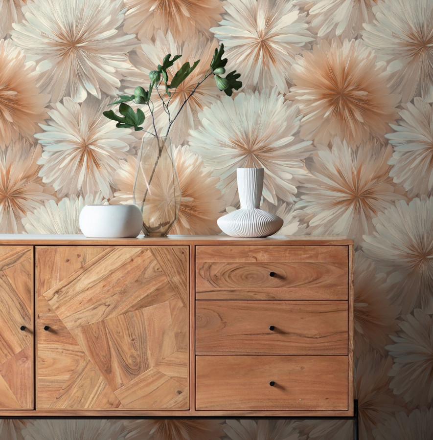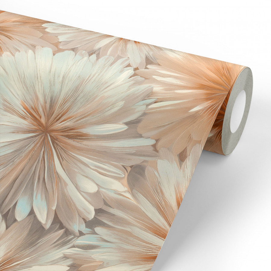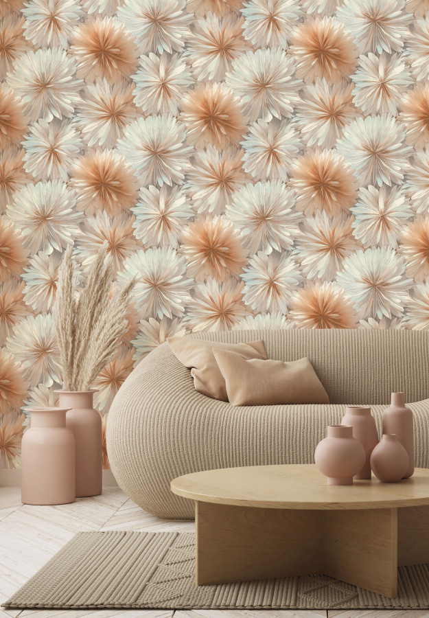 Коллекция виниловых обоев Ornamy «Florance» черпает вдохновение из единства природы и изящества, воплощая его в крупных цветах, напоминающих георгины и хризантемы, чьи лепестки, написанные живописными мазками, переливаются от насыщенного центра к нежным краям, создавая иллюзию шелка. Глиттер и перламутровое покрытие добавляют рисунку глубину и мерцание, подчёркивая каждый изгиб, а матовая фактура фона, подобная декоративной штукатурке, придаёт цветам реалистичность. Однотонные компаньоны помогают легко вписать коллекцию в интерьер, а мягкая гамма сливочных, песочных, серебряных и карамельных оттенков наполняет пространство теплом и воздушностью.