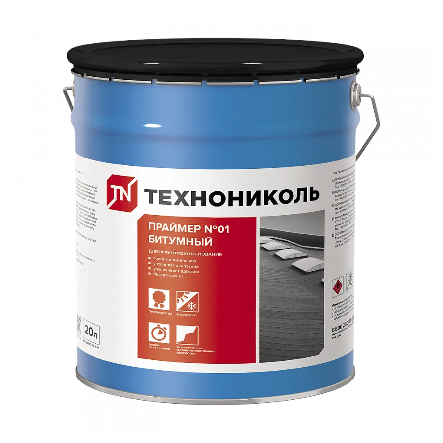 Праймер битумный ТехноНИКОЛЬ № 01 16 кг является готовым к применению раствором. Используется при проведении работ по укладке или наплавлении материалов для кровли, гидроизоляции, самоклеящихся битумных материалов и др.