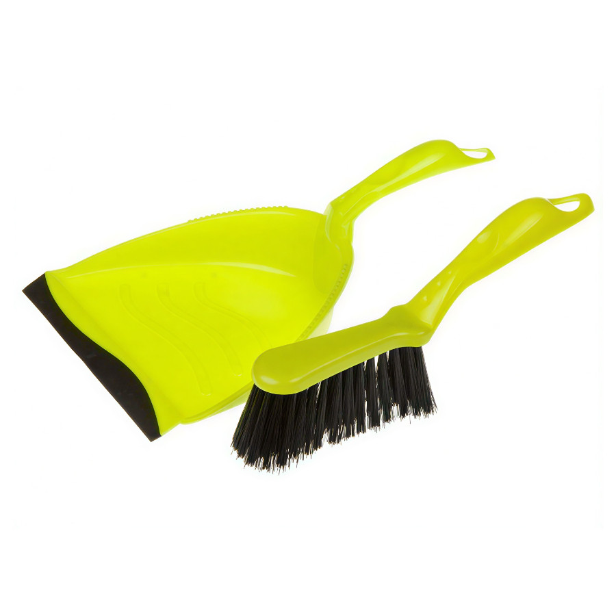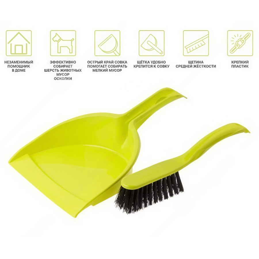 Набор щетка-сметка с совком выполнен из ударопрочного полипропилена, устойчивого к износу и моющим средствам. Салатовый цвет делает инвентарь заметным, а компактные размеры позволяют хранить его даже в небольшом шкафу. Эргономичная форма ручек снижает усталость при длительной уборке.
