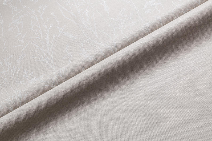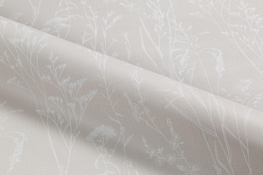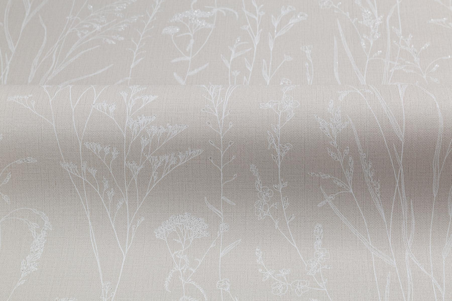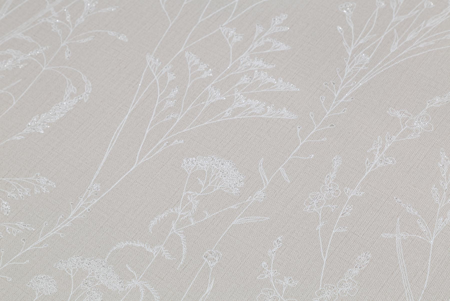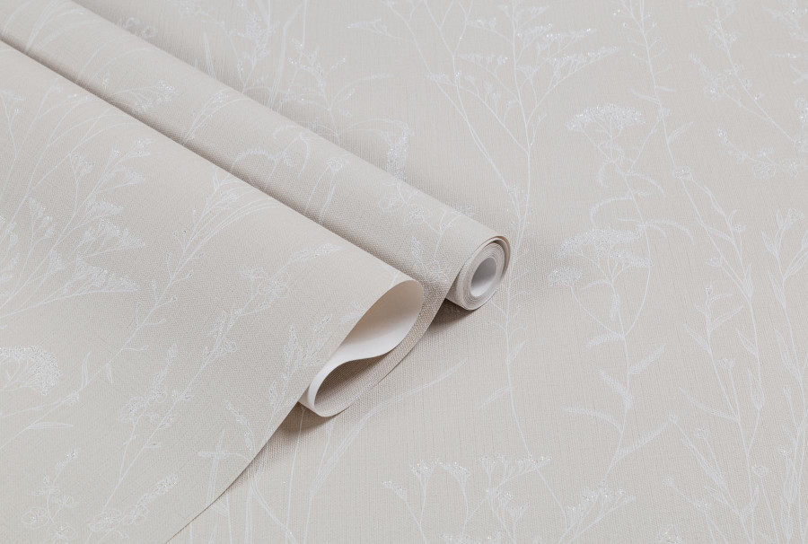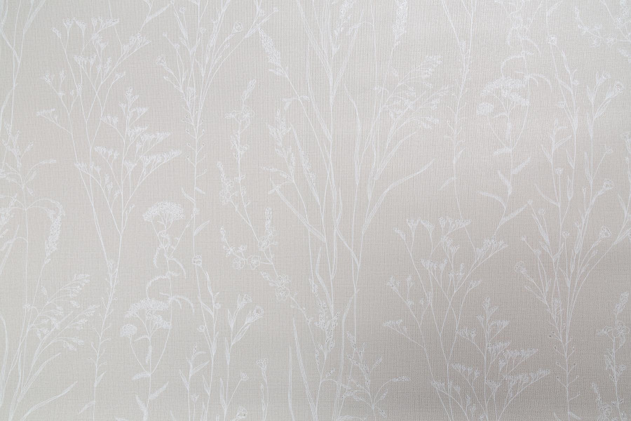 Вертикальный рисунок из тонких стебельков задаёт пространству лёгкий ритм, визуально приподнимая потолки. Природный мотив не выглядит тяжеловесно – он органично вплетается в обстановку, даря ощущение свежести. Особую прелесть добавляют перламутровые акценты: при дневном свете они лишь слегка мерцают, а в вечернем освещении становятся ярче, оживляя поверхность.