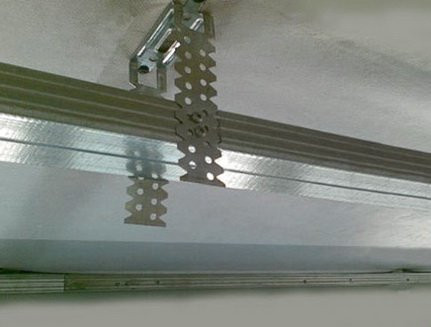- Установить профиль по уровню и закрепить его к подвесу с помощью саморезов.