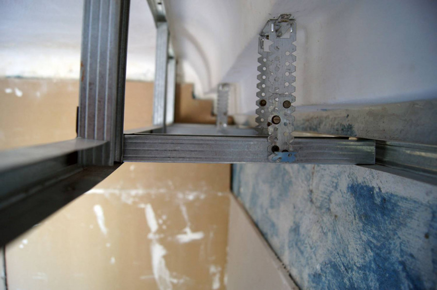 - Фиксация потолочного профиля к базовому основанию.