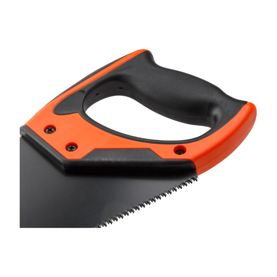Ручная пила по дереву Стартул отличается своей надежностью и комфортным использованием. Рукоятка, изготовленная из ударопрочного обрезиненного пластика, надежно крепится тремя винтами к полотну, обеспечивая комфорт и контроль во время работы. Зубья пилы имеют трехгранную заточку, что делает их более эффективными для пиления древесины и ПВХ. Это делает инструмент универсальным для различных задач.