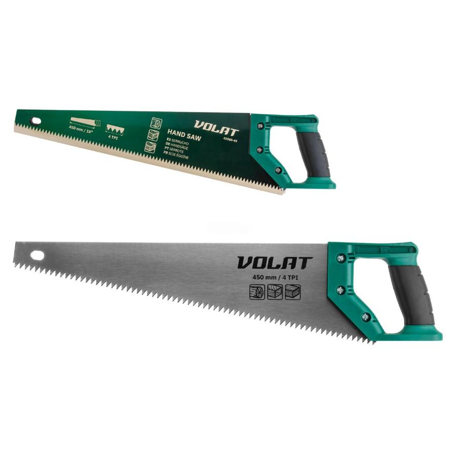 Ножовка по дереву 450 мм ВОЛАТ 4 TPI (крупный зуб) 42080-45 берёт на себя поперечное пиление древесины с лёгкостью. Полотно из инструментальной углеродистой стали 65Mn выдерживает нагрузки, а крупные зубья, четыре на дюйм, ускоряют работу. Зубья идут без заточки, что подходит для грубой резки. Сухое антикоррозийное масло на полотне отталкивает ржавчину, дольше сохраняя ножовку.