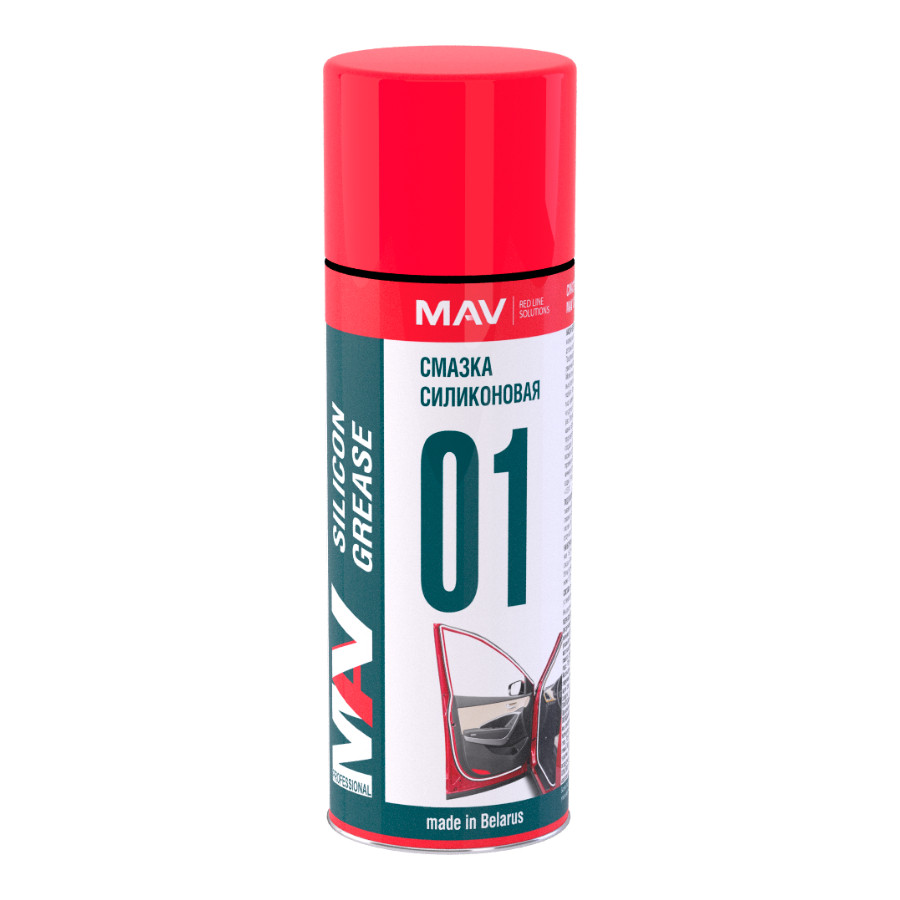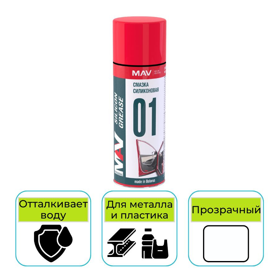 Смазка силиконовая MAV silicon аэрозоль 520 мл – универсальный аэрозольный состав для обработки металлических, резиновых и пластиковых деталей. Продукт создает сверхтонкую полимерную пленку, снижающую трение, вытесняет влагу, предотвращает износ, скрип и коррозию. Смазка не токсична, не испаряется, не смывается водой, сохраняет свойства в интервале от –30°С до +120°С.